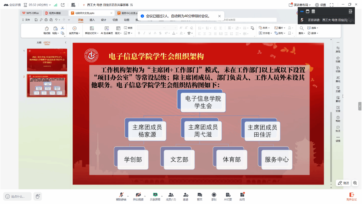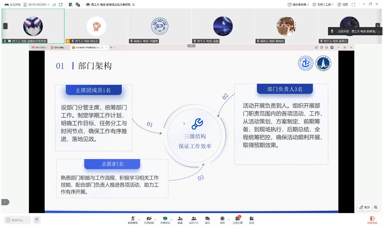 会议伊始,双方学生会负责人依次讲解,围绕组织架构、部门运行模式及特色工作成果展开详细分享。西工大电子信息学院学生会采用“主席团+工作部门”的扁平化架构,无额外层级,主席团由3名成员组成,下设学创部、文艺部、体育部、服务中心4个核心部门;运行上实行“分管主席+部门负责人+志愿者”三级结构,层层压实责任、提升效率。此外,学院分团委下设组织部、宣传部、团委办公室,统筹推进各项团学相关工作,形成协同发力的工作格局。