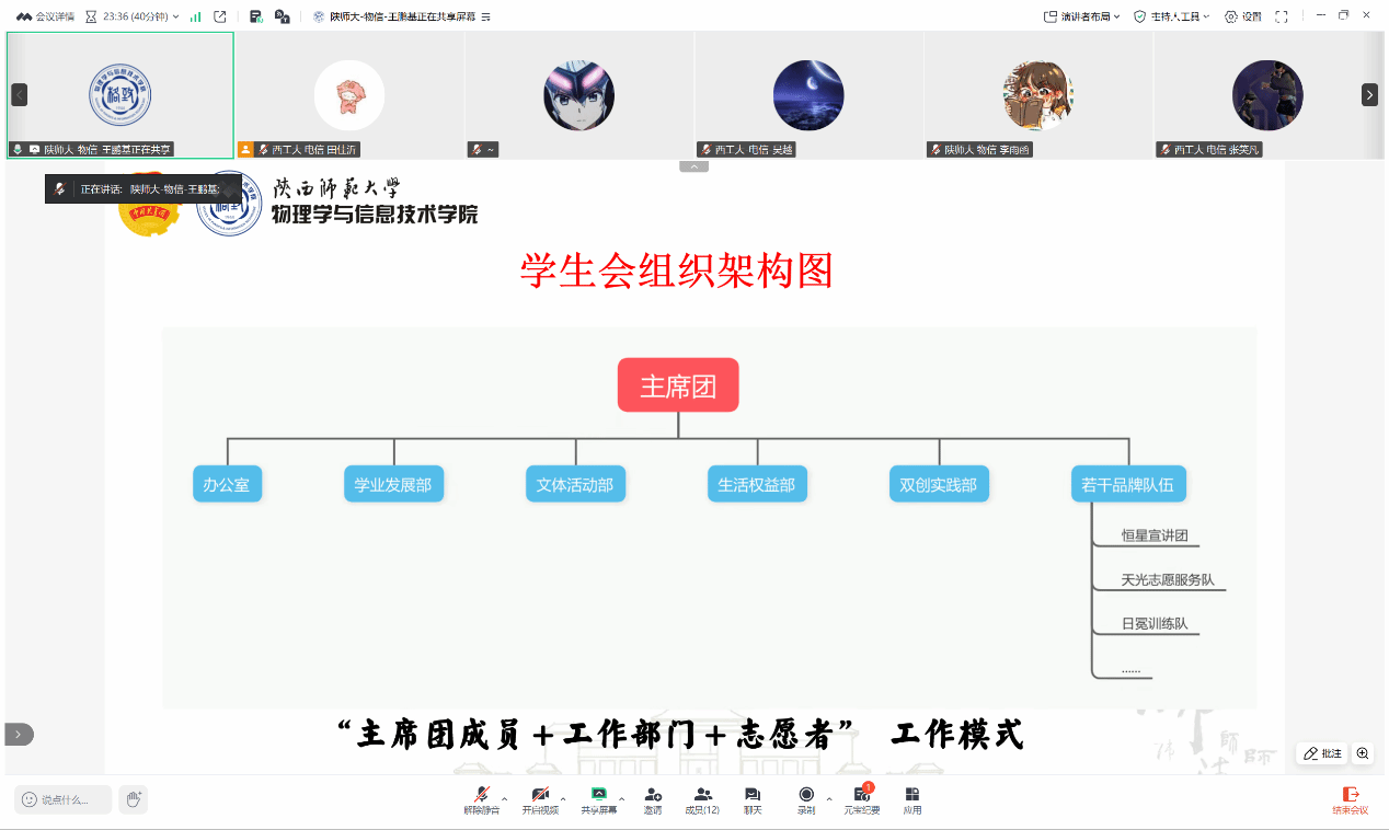 随后,陕师大物理学与信息技术学院学生会负责人介绍了其“主席团+工作部门+志愿者”的清晰架构,主席团统筹全局,下设办公室、学业发展部、文体活动部、生活权益部、双创实践部5个部门,更特色设置恒星宣讲团、天光志愿服务队、日冕训练队等品牌队伍,进一步拓展了学生会的服务边界,展现了贴合学生需求、多元赋能成长的工作特色。双方的分享既有具体架构细节,又有落地实践案例,让在场骨干们收获颇丰、深受启发。