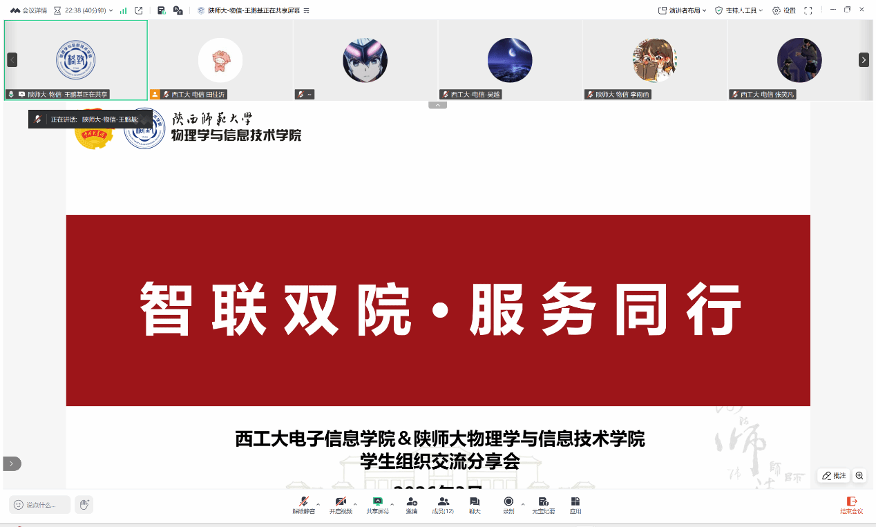 为深化校际学生组织联动,互学互鉴先进工作经验,进一步优化学生会组织管理、提升服务同学能力,3月27日,“智联双院·服务同行”——西北工业大学电子信息学院与陕西师范大学物理学与信息技术学院学生组织交流分享会顺利举行。两院学生会骨干代表在线上展开对话,以分享促交流,以探讨谋发展,共话学生工作新路径。