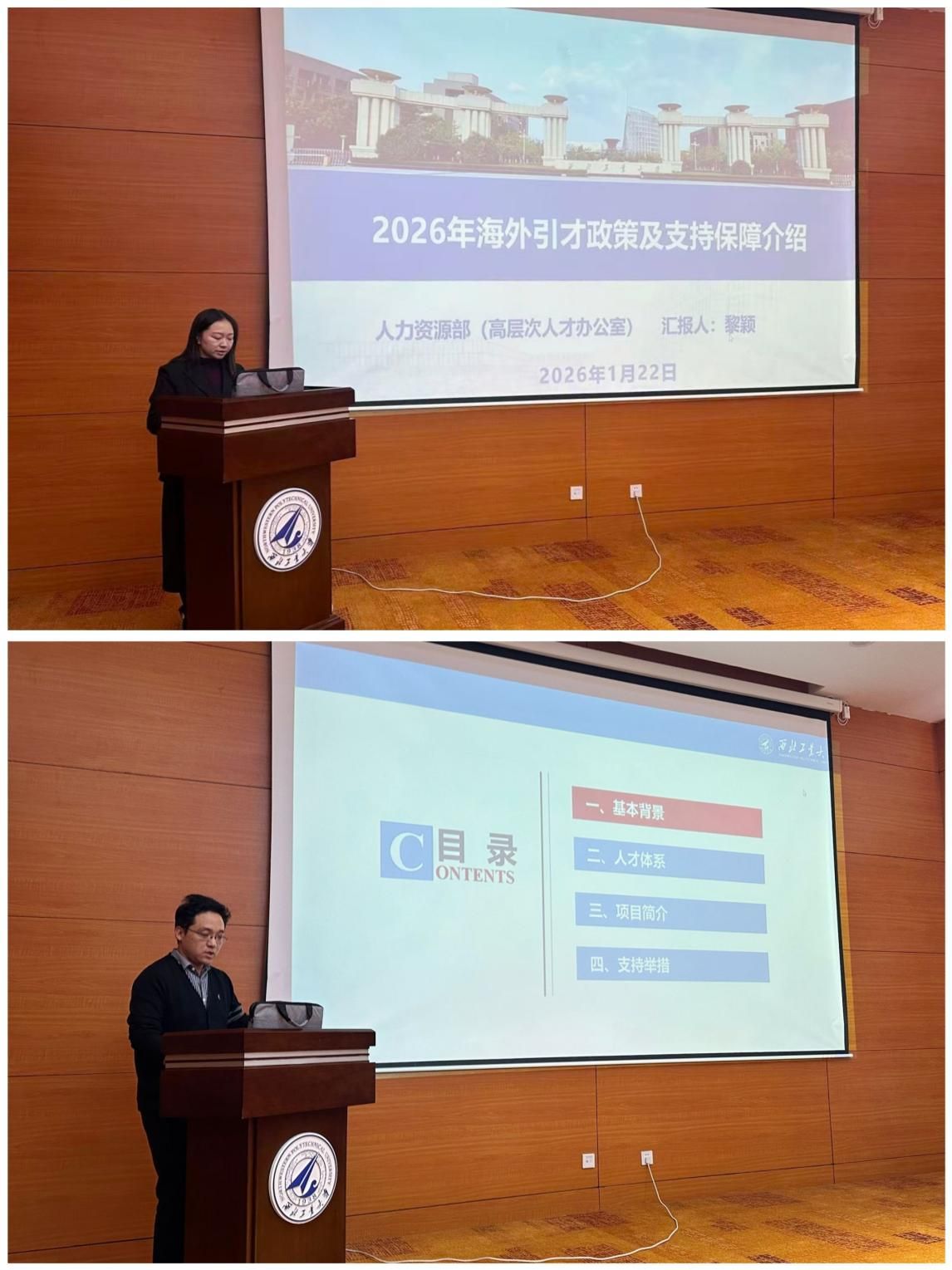 To implement the spirit of the university's 2026 Overseas Outstanding Young Scholars Initiative Meeting and advance the university's One-Ten-Hundred-Thousand development goals, the School of Electronics and Information(SEI) held 2026 Talent Work Promotion Meeting and Talent Project Policy Briefing on January 22nd at Qizhen Building, Chang'an Campus. Li Ying and Ke Wei, business supervisors from the Talent Development and Cultivation Office of the Departtmnt of Human Resources of NPU, were invited to present the policies. Over 40 attendees participated, including Hou Jun, Party Secretary of the SEI, members of the Talent Work Leading Group, directors of faculties (centers), Party branch secretaries, research team leaders, talent ambassadors, and candidates for talent project applications. The meeting was chaired by Hou Jun.